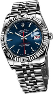 Rolex Datejust Turn-O-Graph часы, полированный круглый корпус из нержавеющей стали (диаметр 36 мм, толщина 11 мм) с завинчивающейся заводной головкой Triplock, специальный вращающийся 18-каратного белого золота »Turn-O-Graph" рифленый безель, браслет из нержавеющей стали с Jubilee , раскладной застежка, синий циферблат подписан "Turn-O-Graph" с красной секундной стрелкой и серебряные часовые индексы на метках, дата календаря на 3 часах. Механизм с автоматическим заводом на 31 камне, Caliber 3135. Oyster Perpetual сертифицированным хронометром COSC, устойчивое к царапинам сапфировое стекло, водонепроницаемость до 100 метров (330 футов).