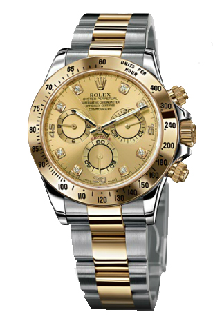 Внутри элегантного корпуса модели Cosmograph Daytona находится шедевр часового мастерства – калибр 4130 с функцией хронографа, разработанный конструкторами Rolex в 2000 году специально для часов Cosmograph Daytona. Яркий образец гениальной простоты: всего 290 деталей, что намного меньше, чем у обычного хронографа.Запас хода часового механизма составляет 72 часа (или 66 часов при пользовании секундомером). Синяя парахромная спираль баланса, изготовленная из уникального по своим антимагнитным свойствам сплава, делает часы в 10 раз более устойчивыми к ударам и сотрясениям, чем обычная спираль.Размер 40 мм, сталь и желтое золото. Циферблат цвета шампанского с 8 бриллиантами. Браслет Oysterlock с желтого золота и стали.