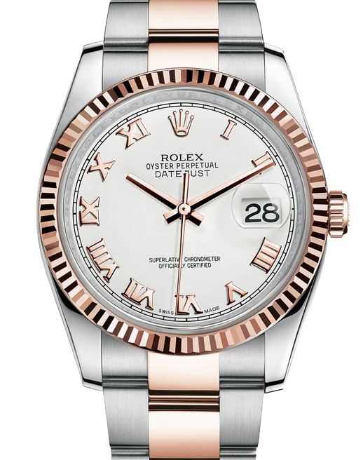 В самых ранних моделях Datejust дата начинала меняться за несколько часов до полуночи. В 1955 году у часов появился механизм переключения даты мгновенного действия, а для более удобного считывания показаний в окошко индикации даты была помещена линза с увеличением в 2,5 раза. Гармоничное сочетание бриллиантов, золота и стали в эффектном корпусе диаметром 36 мм. В модели Datejust 36 мм установлен калибр 3135 с автоматическим подзаводом, полностью разработанный и изготовленный мастерами Rolex. Как и все механизмы Rolex Perpetual, калибр 3135 имеет сертификат швейцарского хронометра, выдаваемый сверхточным часам, успешно прошедшим тестирование в Официальном швейцарском институте хронометрии (COSC). Конструкция, одинаковая для всех механизмов коллекции Oyster, придает модели несравненную надежность. Сталь 904L и 18-каратное золото Everose. Рифленый фирменный безель. Браслет - Oyster c розового золота и стали. Циферблат - белый с римскими золотыми цифрами.