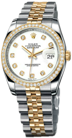 Корпус диаметром 36 мм из нержавеющей стали 904L, применяемой в химической промышленности с безелем из желтого золота с 52 инкрустированными бриллиантами. Сапфировое стекло с лупой над апертурой даты и традиционная водостойкость в 100 метров. В зависимости от модели браслет Jubilee с застежкой короной или обычный Oyster с удлиняющейся Easylink. Механизм, по-прежнему с 1988 года, калибр 3135, с запасом хода 48 часов, 31 камнем, сертифицированный хронометр COSC. Циферблат белый с 10 бриллиантами