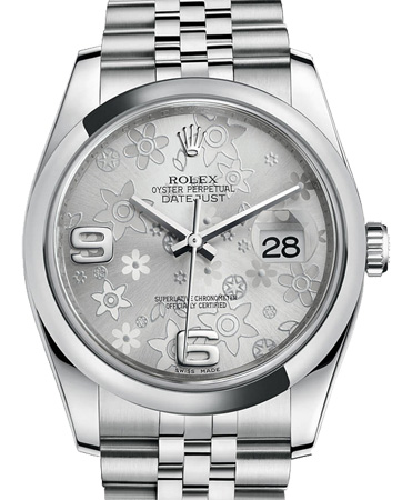 Rolex Datejust 36mm часы, полированный круглый корпус из нержавеющей стали (диаметр 36 мм, толщина 11 мм) с завинчивающейся заводной головкой Triplock, полированная нержавеющый гладкий безель. Браслет Jubilee из нержавеющей стали, OysterLock застежка. Серебристый цветочный циферблат с арабскими цифрами, дата календаря на 3. Механизм с автоматическим заводом на 31 драгоценном камне, Caliber 3135, запас хода 50 часов. Oyster Perpetual сертифицированный COSC хронометр. Устойчивое к царапинам сапфировое стекло, водонепроницаемость до 100 метров.