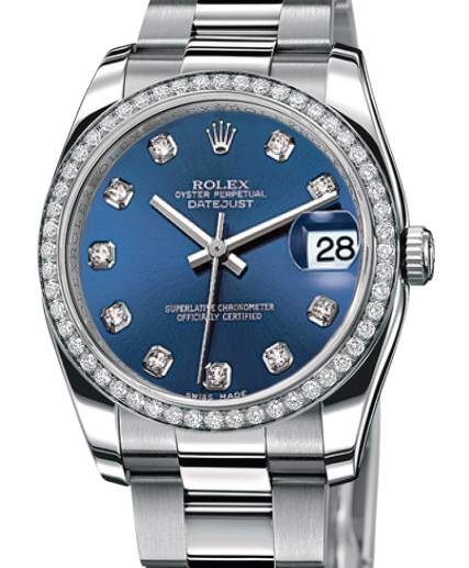 Корпус диаметром 36 мм из нержавеющей стали 904L, применяемой в химической промышленности с безелем из белого золота с 52 инкрустированными бриллиантами. Сапфировое стекло с лупой над апертурой даты и традиционная водостойкость в 100 метров. Браслет обычный Oyster с удлиняющейся Easylink. Механизм, по-прежнему с 1988 года, калибр 3135, с запасом хода 48 часов, 31 камнем, сертифицированный хронометр COSC. Главной отличительной чертой является циферблат модели, синий с 8 бриллиантами вместо меток.