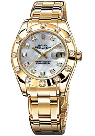 На безеле из золота сияют двенадцать бриллиантов классической огранки, изящно вставленных в оправы из 18-каратного белого золота. Циферблат - белый перламутровый с 10 бриллиантами вместо меток. Прослеживается яркий, утонченный и околдовывающий стиль Datejust Special Edition.