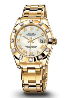 Хронометр - Сертификация COSC. Механизм с автоподзаводом, Caliber 2235 на 31 камне с запасом хода 42 часа. Окошко даты с лупой находится в положении 3 часов. Браслет - Pearlmaster из желтого золота 750 пробы с застежкой Crownclasp.