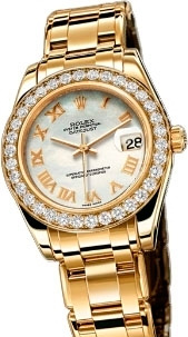 Высокое мастерство и часовое искусство. Здесь часы Datejust 34mm Special Edition Yellow Gold 34 Diamond Bezel 81298 – воплощение классической женственности – представлены в исполнении из 18-каратного желтого золота. С самого первого взгляда 18-каратное желтое золото часов Datejust Special Edition задает тон: оно оказывает неотразимое воздействие и придает часам особую индивидуальность. С помощью специальных резцов ювелир, словно скульптор, вырезает в металле каст (оправу) для закрепки бриллианта. Когда каст подготовлен, он ловким движением руки вставляет в него камень. Каждый камень тщательно позиционируется относительно других, после чего он надежно закрепляется в золотой или платиновой оправе обжатием металла по периметру. На безеле из золота сияют 34 бриллианта классической огранки, изящно вставленных в оправы из 18-каратного белого золота. Циферблат - белый перламутровый с римскими цифрами из желтого золота. Прослеживается яркий, утонченный и околдовывающий стиль Datejust Special Edition. Хронометр - Сертификация COSC. Механизм с автоподзаводом, Caliber 2235 на 31 камне с запасом хода 42 часа. Окошко даты с лупой находится в положении 3 часов. Браслет - Pearlmaster из желтого золота 750 пробы с застежкой Crownclasp.