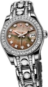 Rolex Lady Datejust Pearlmaster часы, круглые полированные 18-каратного белого золота (29 мм диаметр, 10 мм толщина), безель 18-каратного белого золота инкрустирован с 40 безупречными бриллиантами багетной огранки, 18-каратного белого золота Pearlmaster браслет со скрытой застежкой инкрустирован 174 бриллиантами в два ряда и 14 крупными бриллиантами (по одному на каждое звено), темный перламутровый циферблат инкрустирован с 10 бриллиантами. Механизм на 31 драгоценном камне, Caliber 2235 с запасом хода 42 часа.Окошки даты с лупой находится в положении на 3 часа. Завинчивающаяся заводная головка, устойчивое к царапинам сапфировое стекло, водоустойчивы до 100 метров.