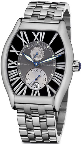 Черный циферблат с серым центром и двумя светло-серыми дополнительными циферблатами: секундным и индикатором запаса хода. Крупные, стального цвета, римские цифры. На секундном циферблате расположено круглое окошечко даты. Стрелки и часовые метки люминесцентные. Сертифицированные часы-хронометр (COSC).