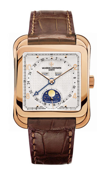 На строгом квадратном циферблате этих часов находятся два окошка - дня недели и месяца, и индикатор фаз луны. 36 камней.