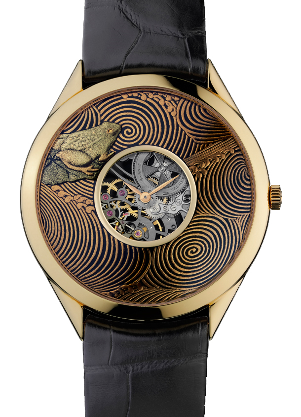 Механизм - с ручным заводом, Калибр 1003 SQ. Корпус - розовое золото 18к. Циферблат - черный, японский лак Maki-e, "Лягушка и гортензия". Запас хода - 31 час. Ремешок - кожа аллигатора с золотой 18к вставкой. Водонепроницаемость 30 м.