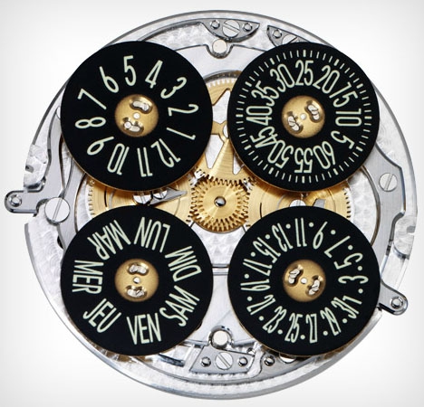 Вдохновением для создания дизайна часов послужила классическая китайская иконография. На золотом эмалированном циферблате, созданном по специальной женевской технике Grand Feu, притаилась свернутая клубочком змея, выгравированная из золота, платины или бронзы на выбор. Вокруг нее, на фоне золотых листьев, симметрично расположены четыре окошка, отображающие часы, минуты, дату и день недели.