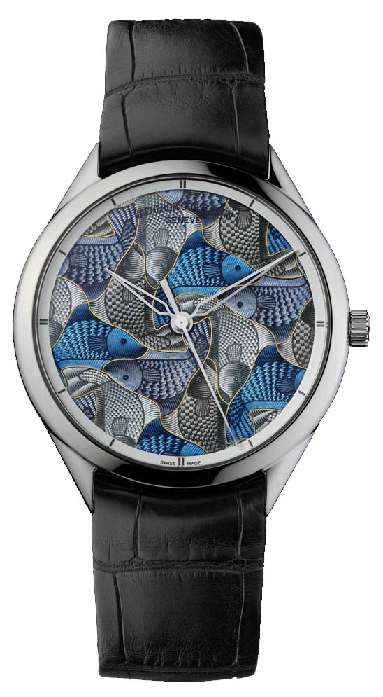 На циферблате этой модели из коллекции «Métiers d’Art – Les Univers Infinis» в изящных серо-синих тонах изображена стая плещущихся рыб. Мотив этой композиции, созданной с помощью гильоширования и эмалевой росписи клуазон, позаимствован из работы руки Маурица Корнелиса Эшера.