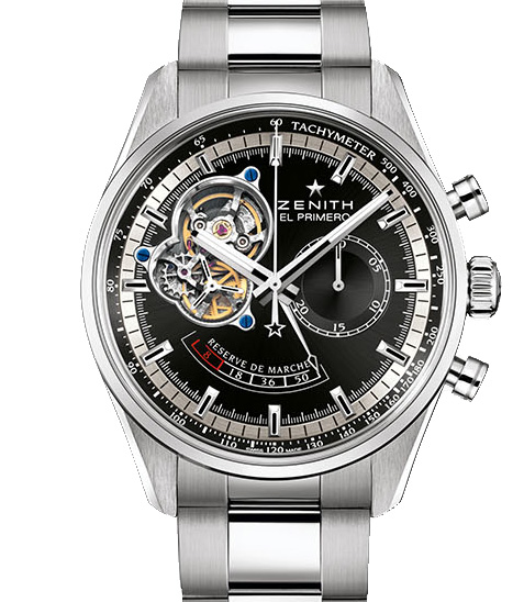 Модель вобрала в себя лучшие часовые традиции: механизм хронографа с колонным колесом, индикация запаса хода, платина с родиевым напылением, мосты с жемчужным зернением и скошенными кромками, продольное сатинирование молоточков, обычных и переводных рычагов, отделка гильоше «Côtes de Genève» на роторе, ажурная конструкция, контрастно выделяющая звезду ZENITH, и тахиметрическая шкала на фланце, напоминающая о хронографах эпохи первых автогонок. Тщательность, с которой выполнена каждая деталь механизма, достойна восхищения. Новинка представлена на стальном браслете.